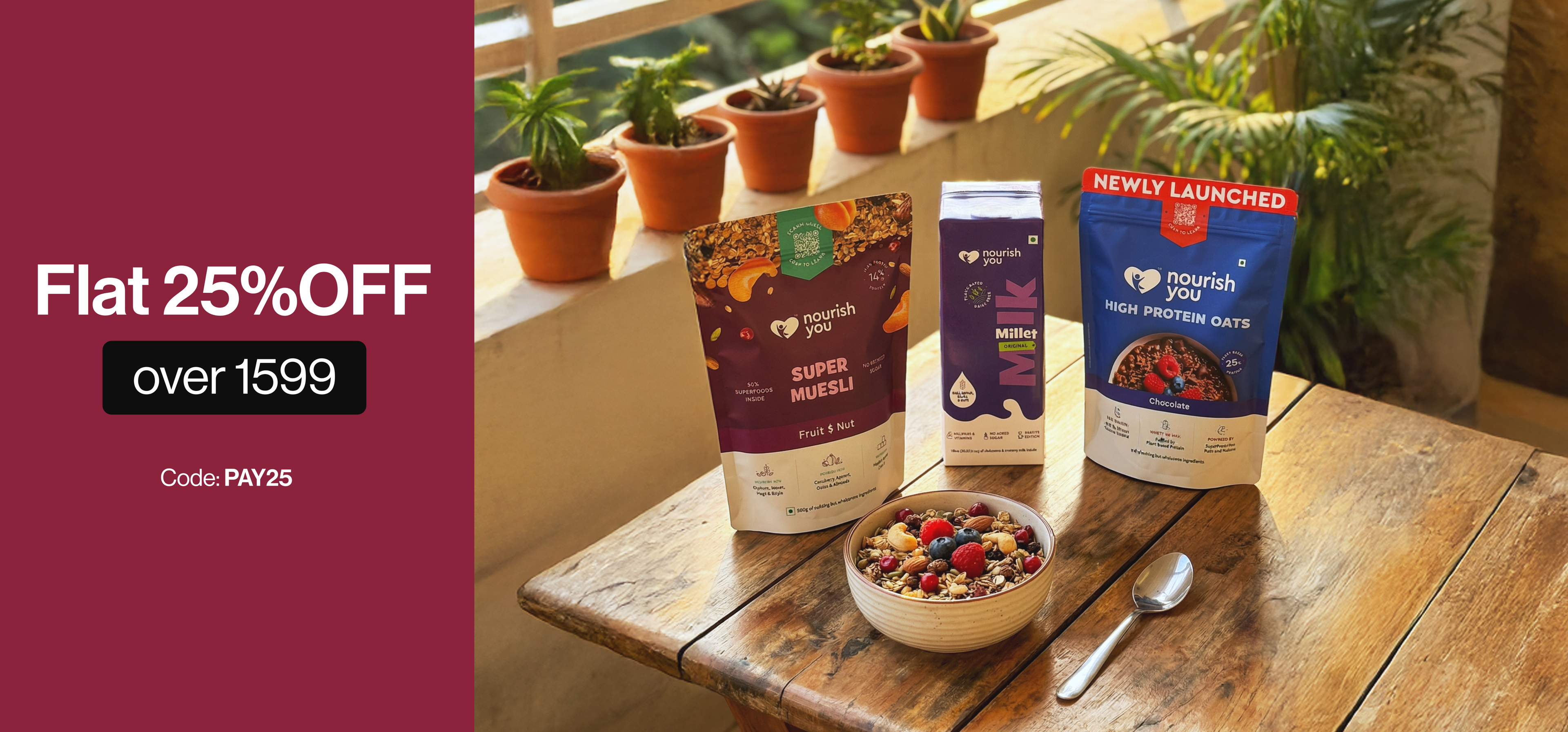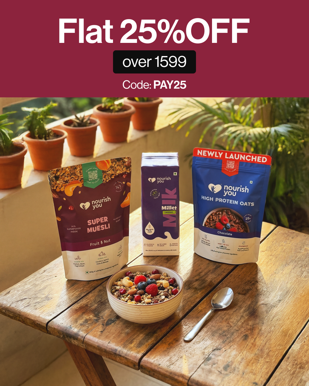 Indulge in Nourish You's homegrown Belgium dark chocolate muesli, a plant-based, gluten-free, homegrown millet blend (ragi, jowar, bajra) delight c...