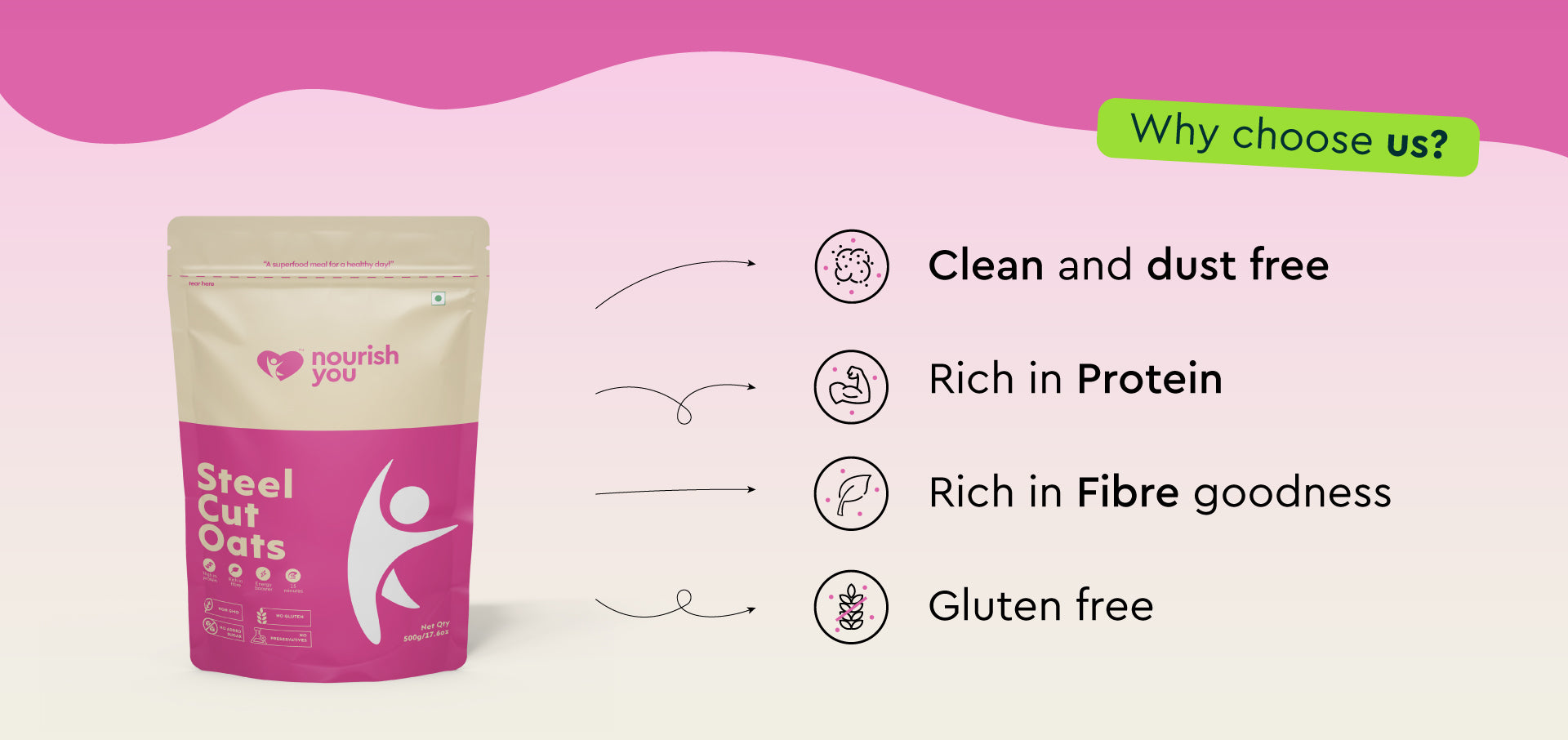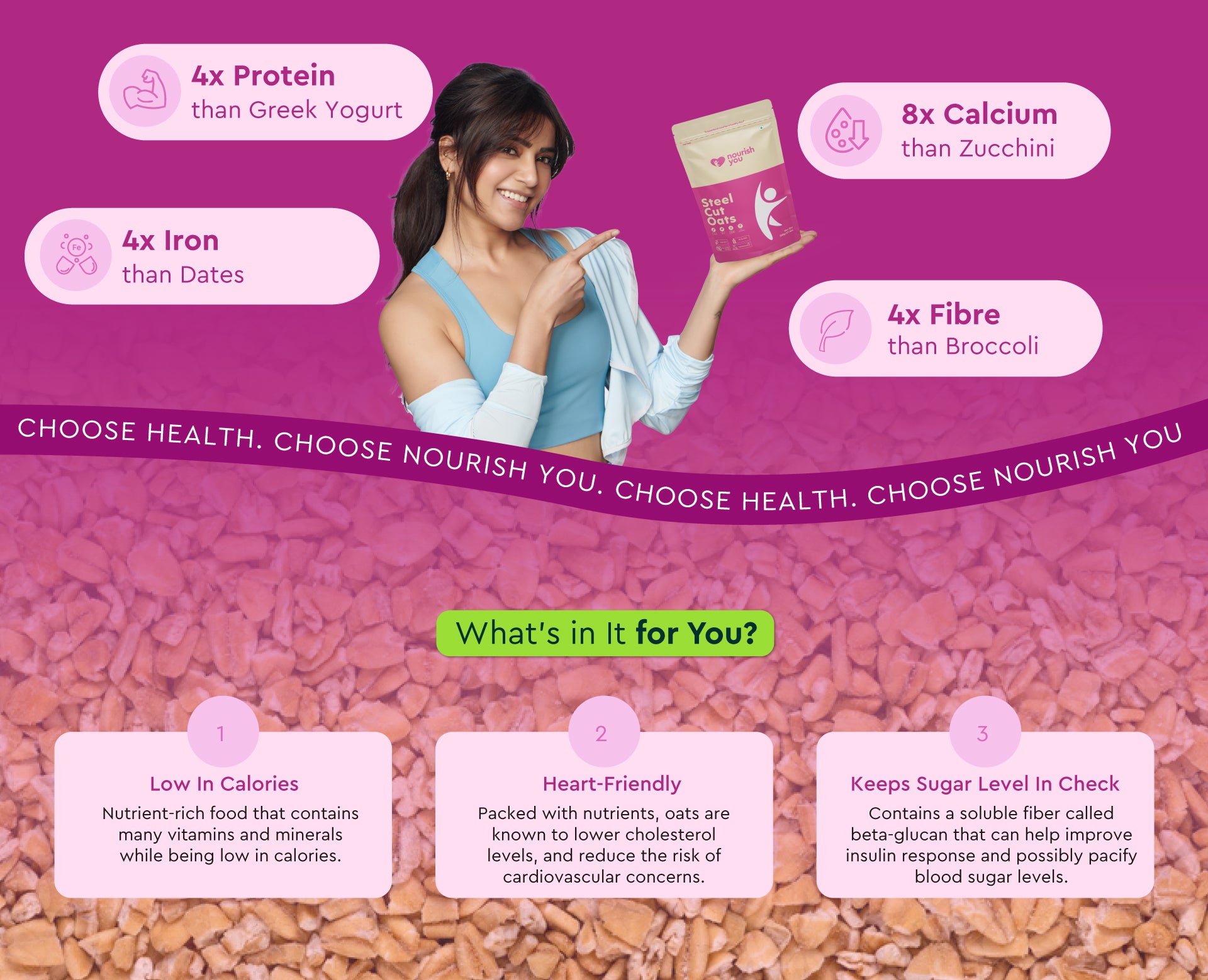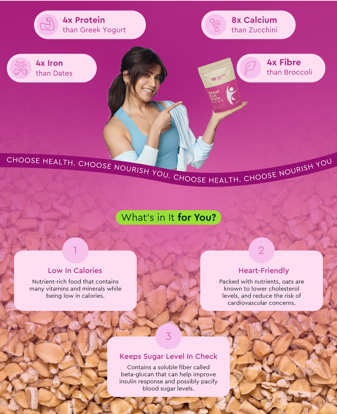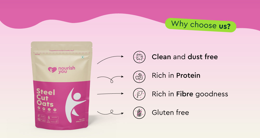Nourish you's Steel cut oats are a high-fiber food that plays a key role in weight management. Rich in soluble fiber, they help promote a feeling of fullness and support healthy digestion. These hearty oats provide steady energy throughout the day while stabilizing blood sugar levels. Their nutty texture and versatility make them a perfect choice for a wholesome breakfast or snack, helping you maintain a balanced, healthy lifestyle.
