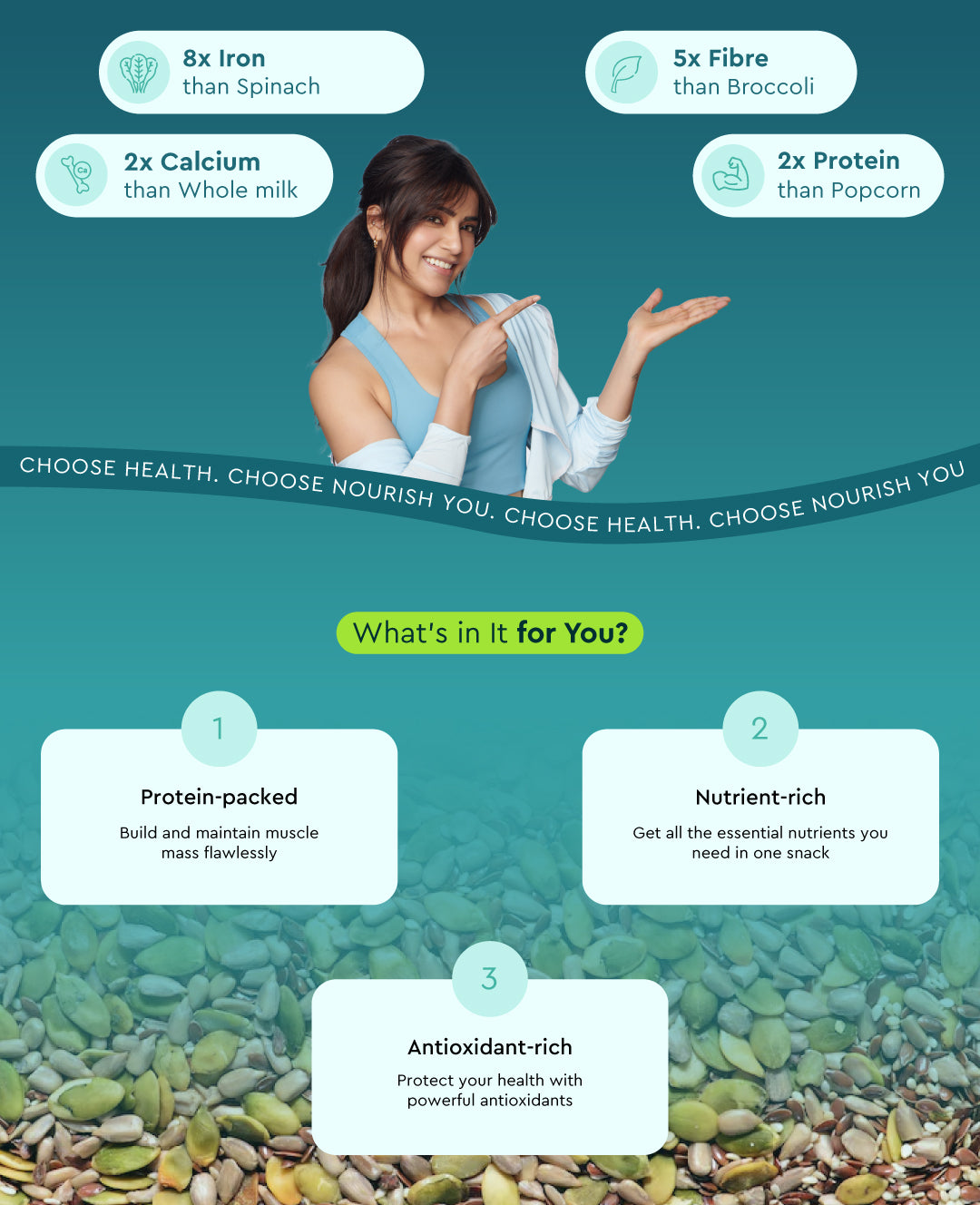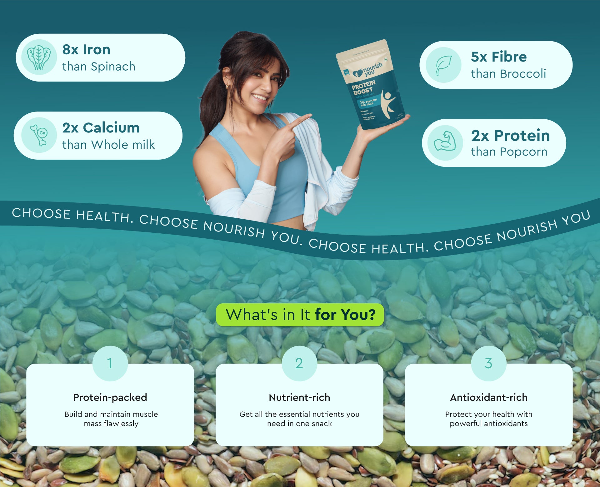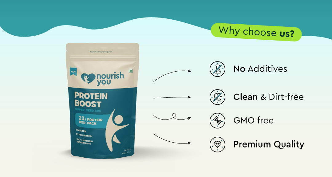 Fuel your day with Nourish you's homegrown Protein Boost. This guilt-free snack is packed with plant-based protein, rich in calcium, and brimming with fiber. A delicious and nutritious plant-based option, our seed mix provides a satisfying and energizing crunch. Enjoy a wholesome and convenient way to boost your protein intake.