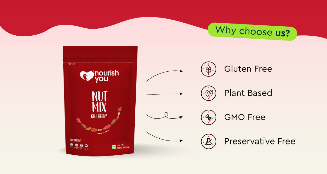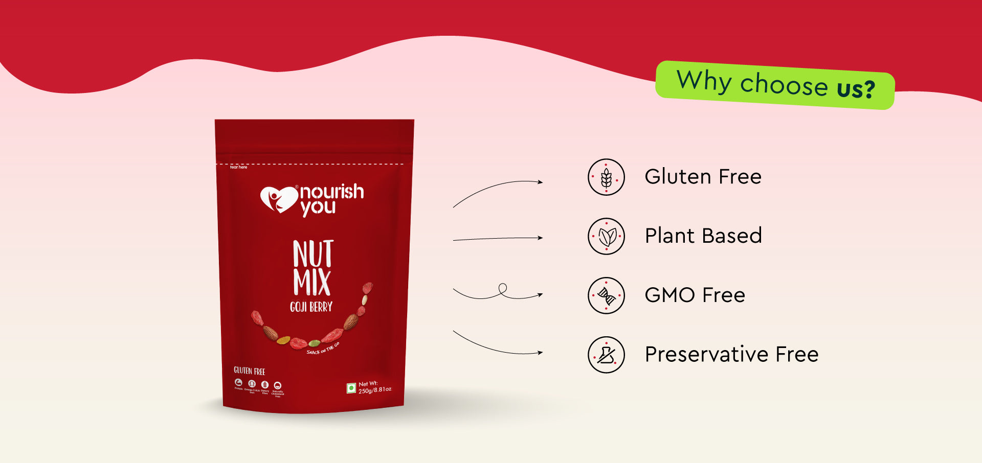 Nourish You's Goji Berry Fruit and Nut Mix is the ultimate healthy snack, blending the goodness of nutrient-packed fruits and nuts to fuel your day. This plant-based, gluten-free mix is rich in iron to support energy and healthy blood flow, high in fiber to aid digestion and keep you feeling full and loaded with protein for muscle repair. Bursting with antioxidants to combat free radicals, this delicious fruit and nut mix is a perfect on-the-go snack for a wholesome, balanced lifestyle!