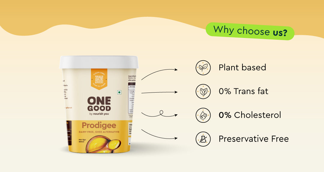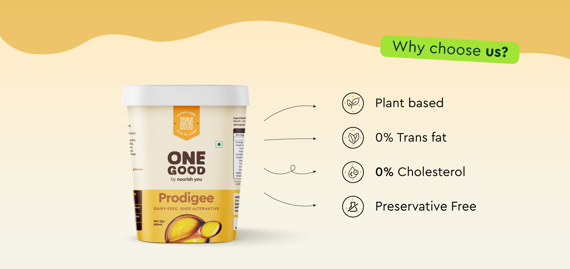 Golden, aromatic, and 100% plant-powered, this is prodigee with a twist. Crafted from a blend of premium oils, it sizzles, spreads, and shines like the real deal. No dairy, just deep flavour and rich tradition in every spoon. It’s prodigee, but guilt-free!