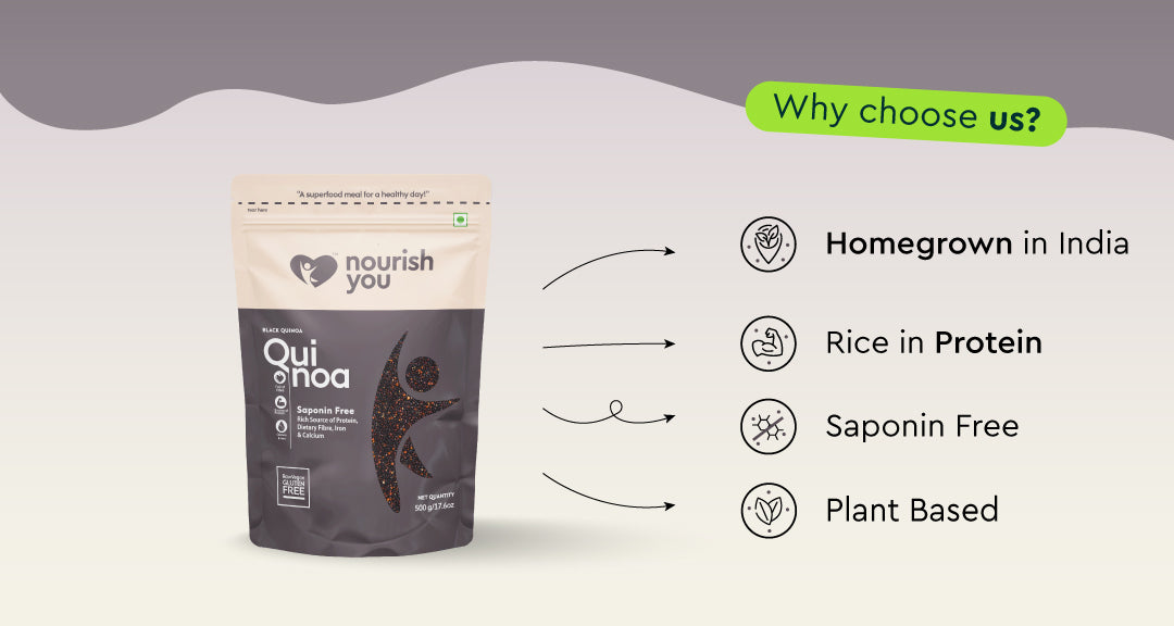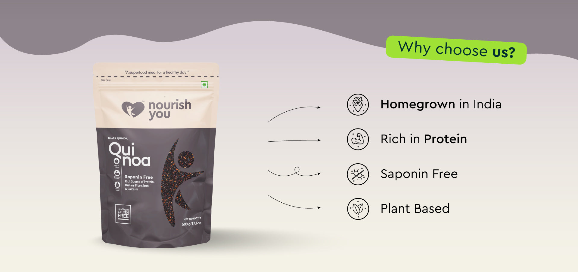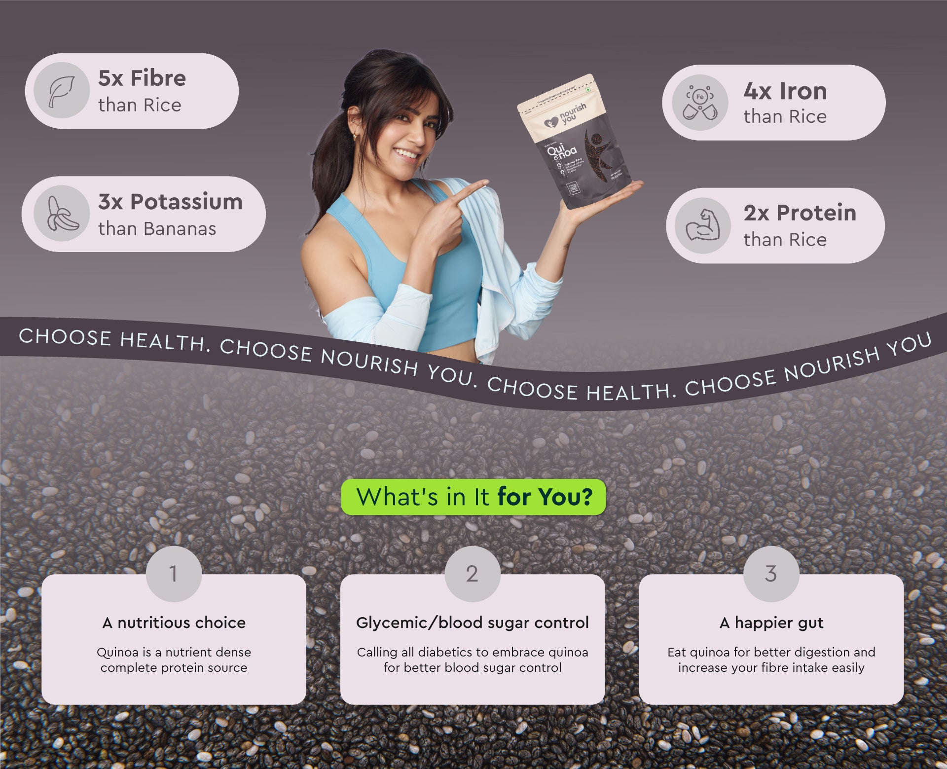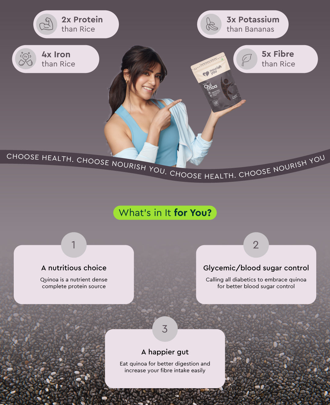 Nourish You's Black Quinoa is a nutrient-dense rice alternative and a high-protein superfood, ideal for weight management and healthy living. This homegrown whole protein grain is packed with essential amino acids, providing an excellent plant-based protein source. Rich in fiber, it supports digestion and keeps you fuller for longer. With its striking color and nutty flavor, black quinoa is a versatile addition to salads, bowls, and more, combining nutritional value with a satisfying, wholesome taste.