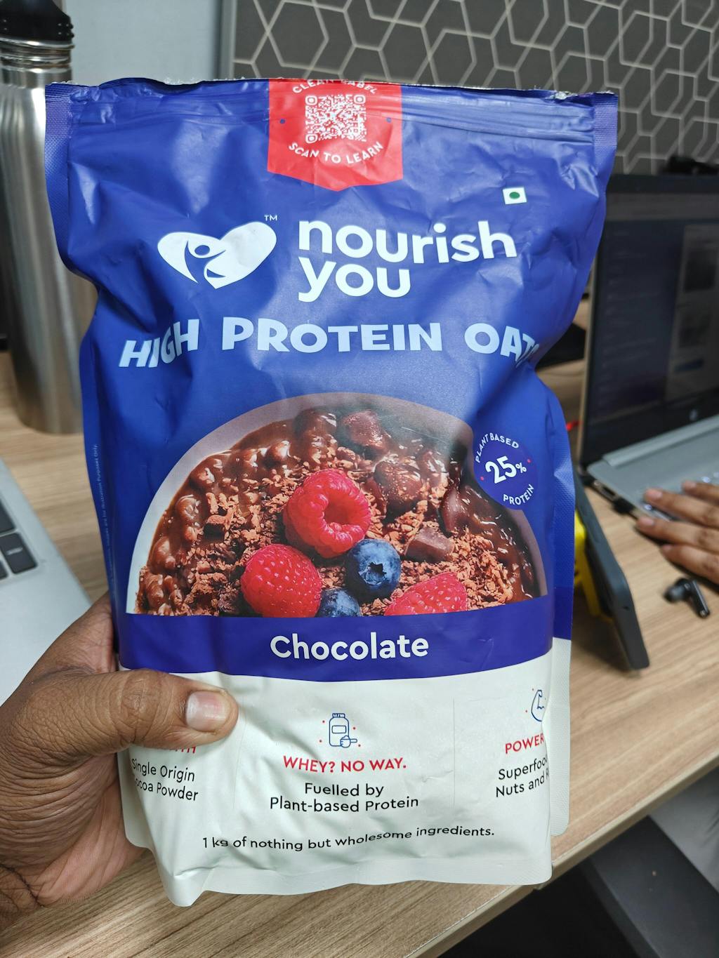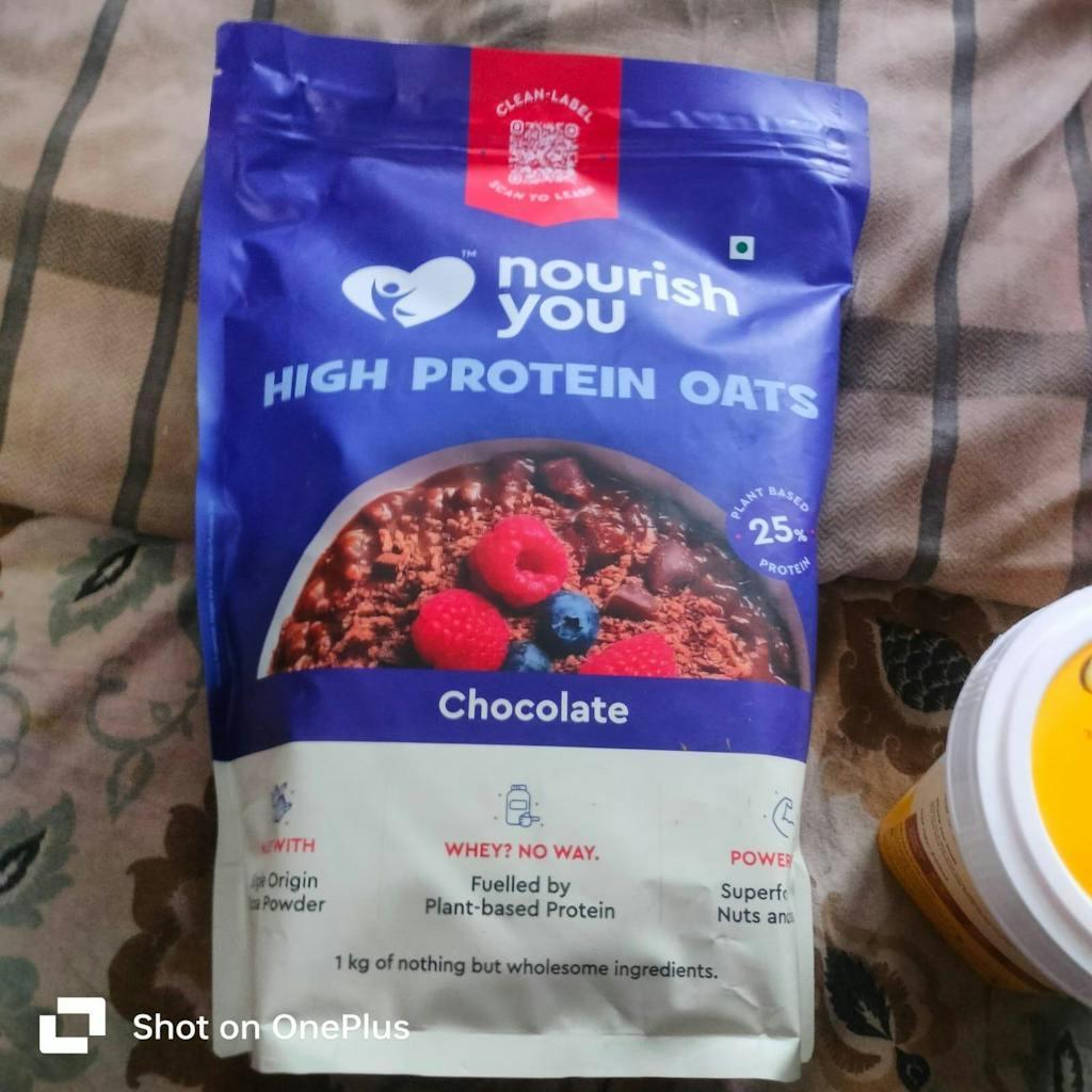 Introducing Nourish You High Protein Oats – India’s first 25g protein bowl made purely with vegan protein from soya. Made with single-origin chocolate, peanut butter, raw sugar, and real superfoods like oats, almonds, chia seeds, and pumpkin seeds, it’s high in fibre, non-GMO, and contains no whey or refined sugar. Wholesome, clean, and plant-powered—just the way Nourish You nourishes you.