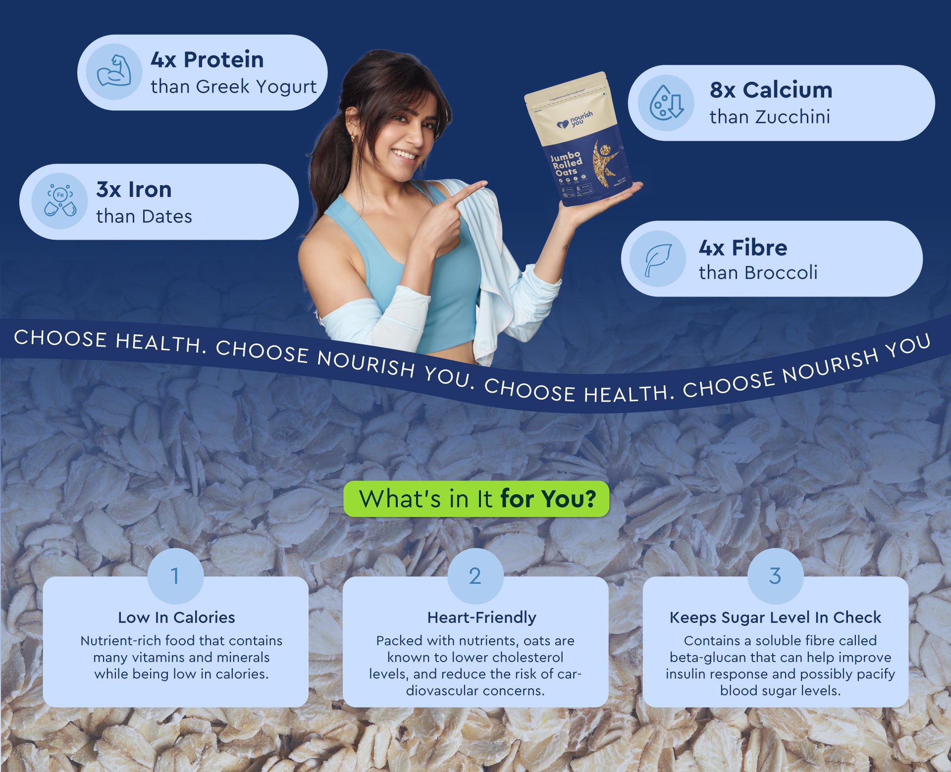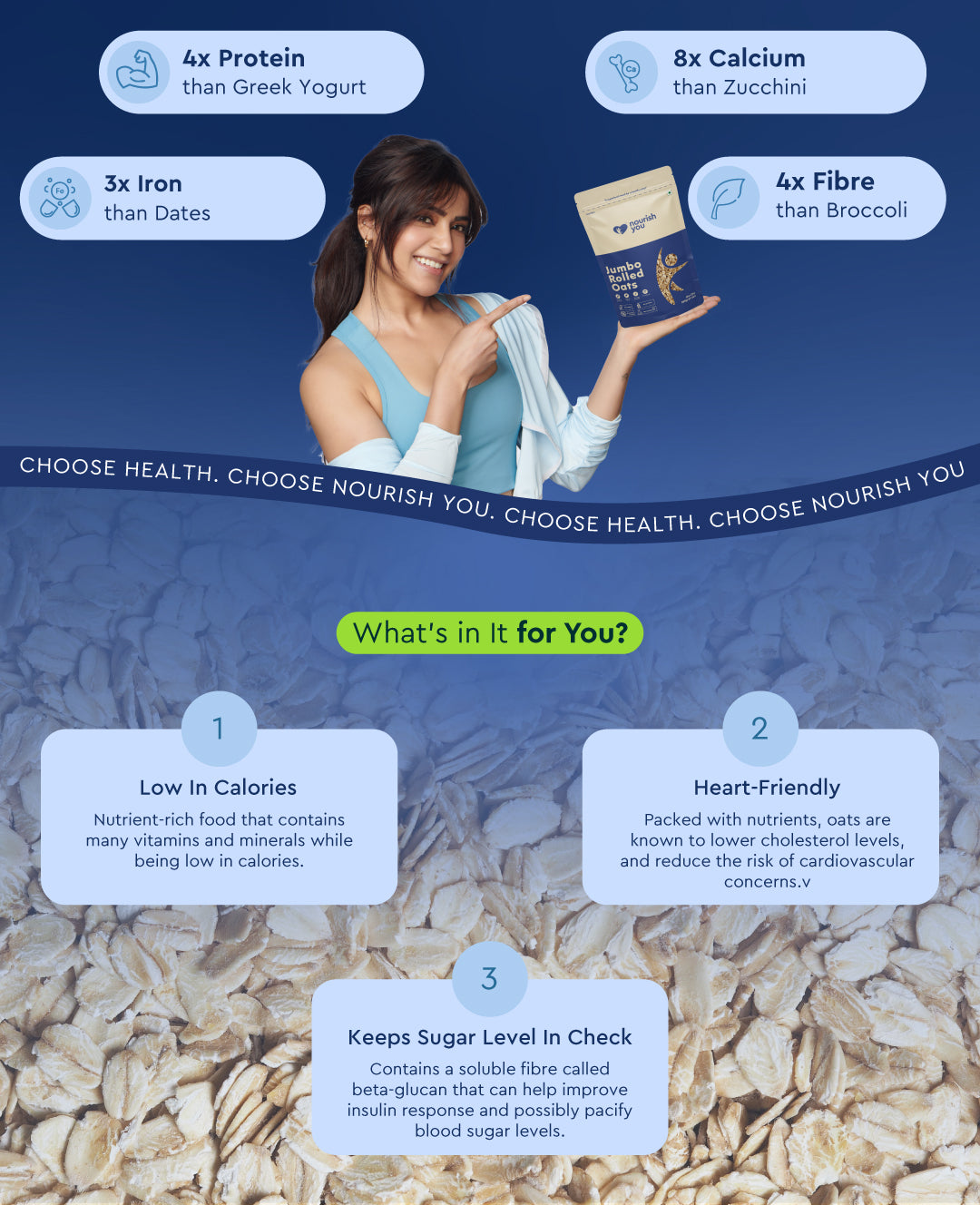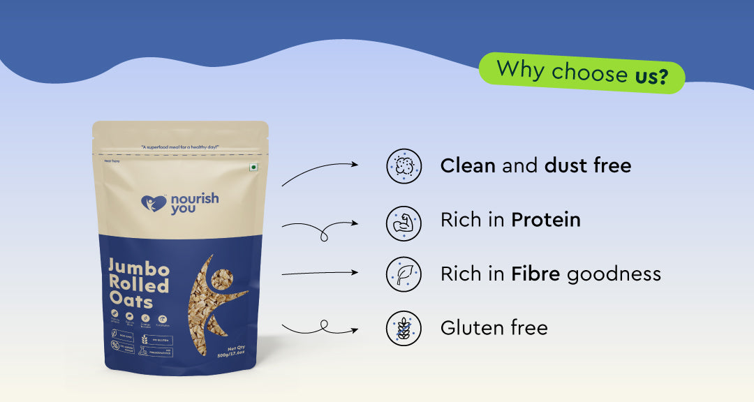 Nourish you's Rolled oats are a high-fiber food that plays a key role in weight management. Rich in soluble fiber, they help regulate digestion, promote a feeling of fullness, and support healthy cholesterol levels. A nutritious and versatile option, rolled oats are perfect for breakfast or snacks, providing long-lasting energy and keeping you satisfied throughout the day. With their hearty texture and wholesome benefits, they’re an essential part of a balanced diet.