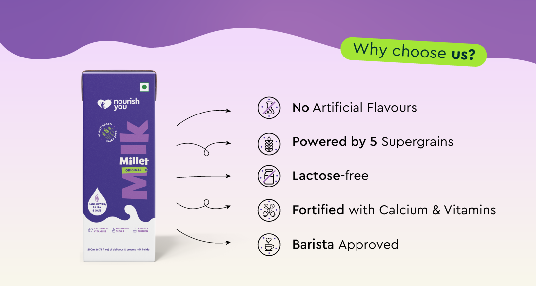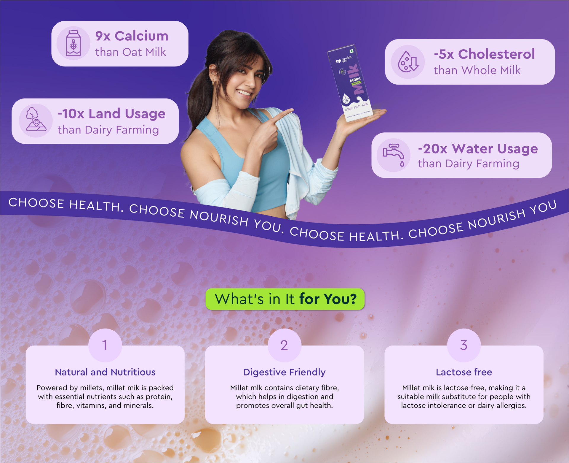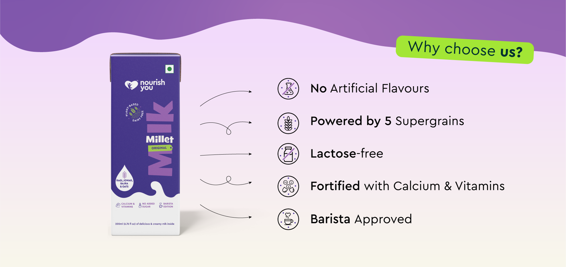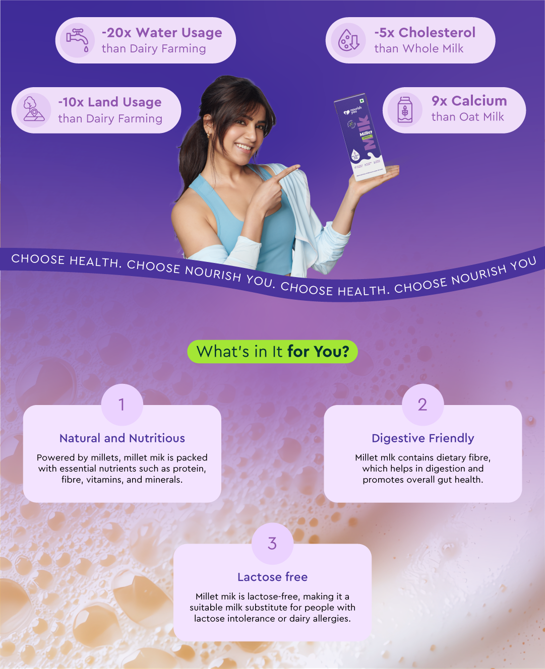 Nourish You Millet Mlk is a plant based mlk made from a blissful blend of homegrown millets (ragi, jowar, bajra) and oats. The millets power our mlk with a healthy dose of nutrition, and the oats add a rich creamy texture. The Barista edition is crafted to be a part of your sacred coffee and chai rituals, without taking away any of the taste. This nourishing plant-based mlk is an ideal companion in your health journey, as it is free from refined sugar, lactose, soy, gluten, artificial flavours and preservatives.
